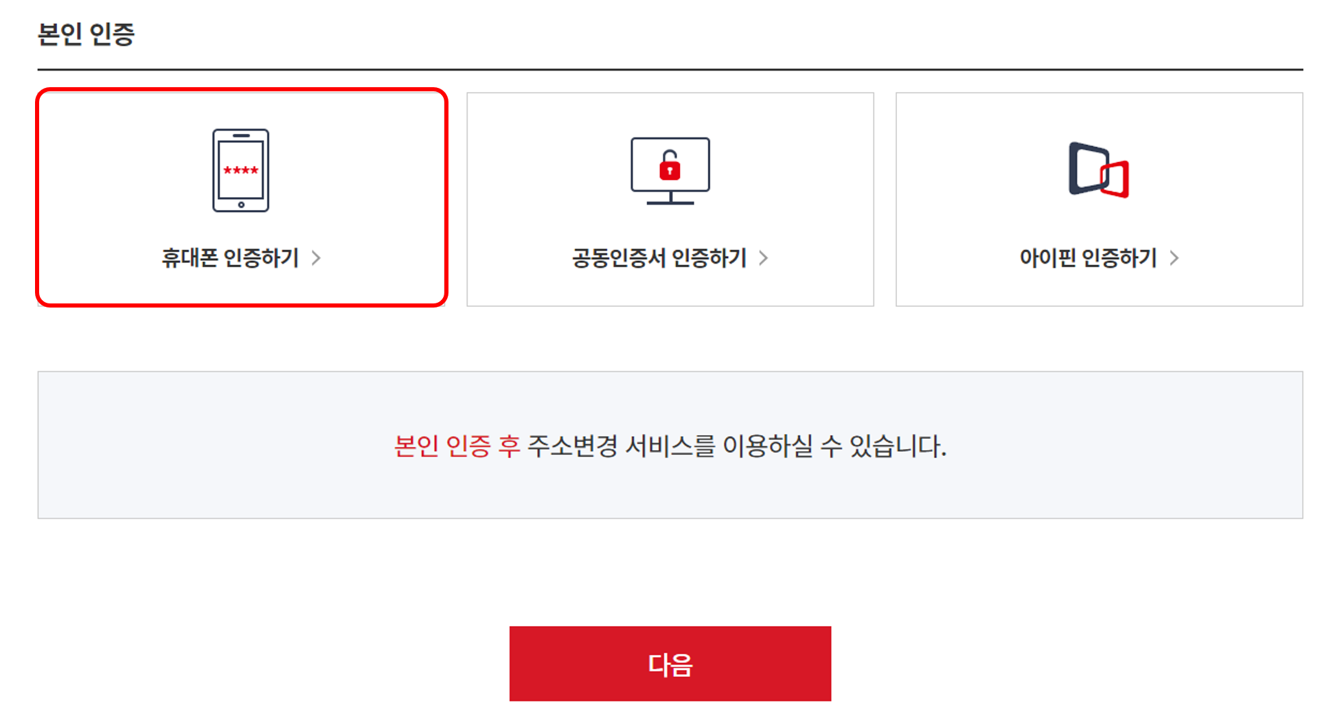 휴대폰, 공동인증서, 아이핀 인증하기 중에서 본인에게 편한 인증 수단을 선택합니다. 저는 저에게 가장 편한 휴대폰 인증하기를 선택하였습니다.