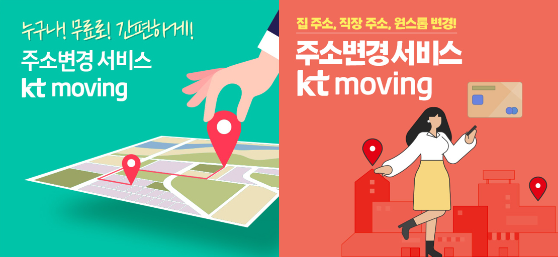 이사 등의 이유로 주소변경을 해야 할 때, 먼저 주민센터에 전입신고를 해야 합니다. 그리고 주소변경 원클릭 서비스 KT Moving을 통해 제휴사에 등록된 주소를 일괄 변경할 수 있습니다. 그리고 그 외 쇼핑몰 등의 주소는 수동으로 변경해야 합니다. 마지막 최후의 보루로 주민센터나 우체국을 통해 우편물 주소변경을 하면 됩니다.