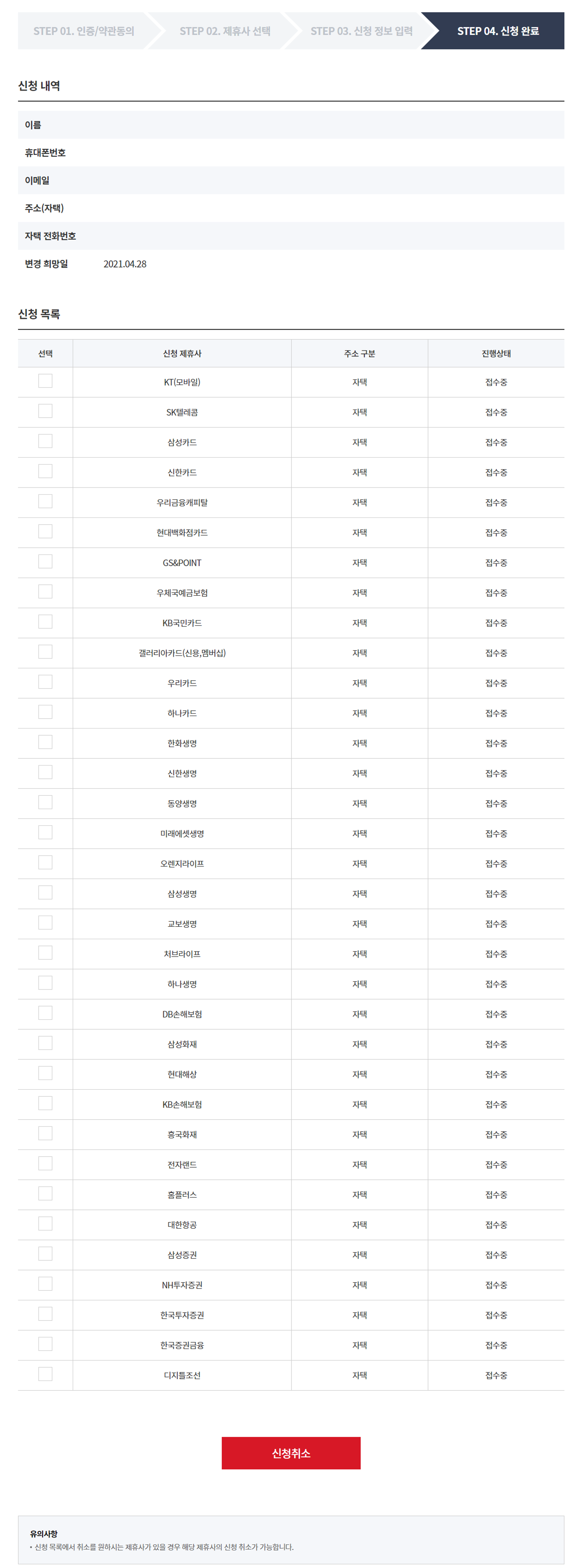 신청을 완료하면 신청인의 이름, 휴대폰 번호, 이메일, 자택 주소, 자택 전화번호, 그리고 변경 희망일이 나오고, 신청한 제휴사의 목록이 나타납니다. 최종적으로 내용을 확인하여 삭제할 제휴사는 이 단계에서 삭제하면 됩니다. 모든 신청을 완료하면 진행상태가 [접수중]으로 나타나고, 완료되면 입력한 이메일로 통보가 오게 됩니다.