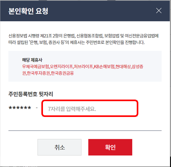 제휴사 선택을 마치면 본인 확인 요청란에 주민등록번호 뒷자리 7자리 숫자를 입력합니다.
