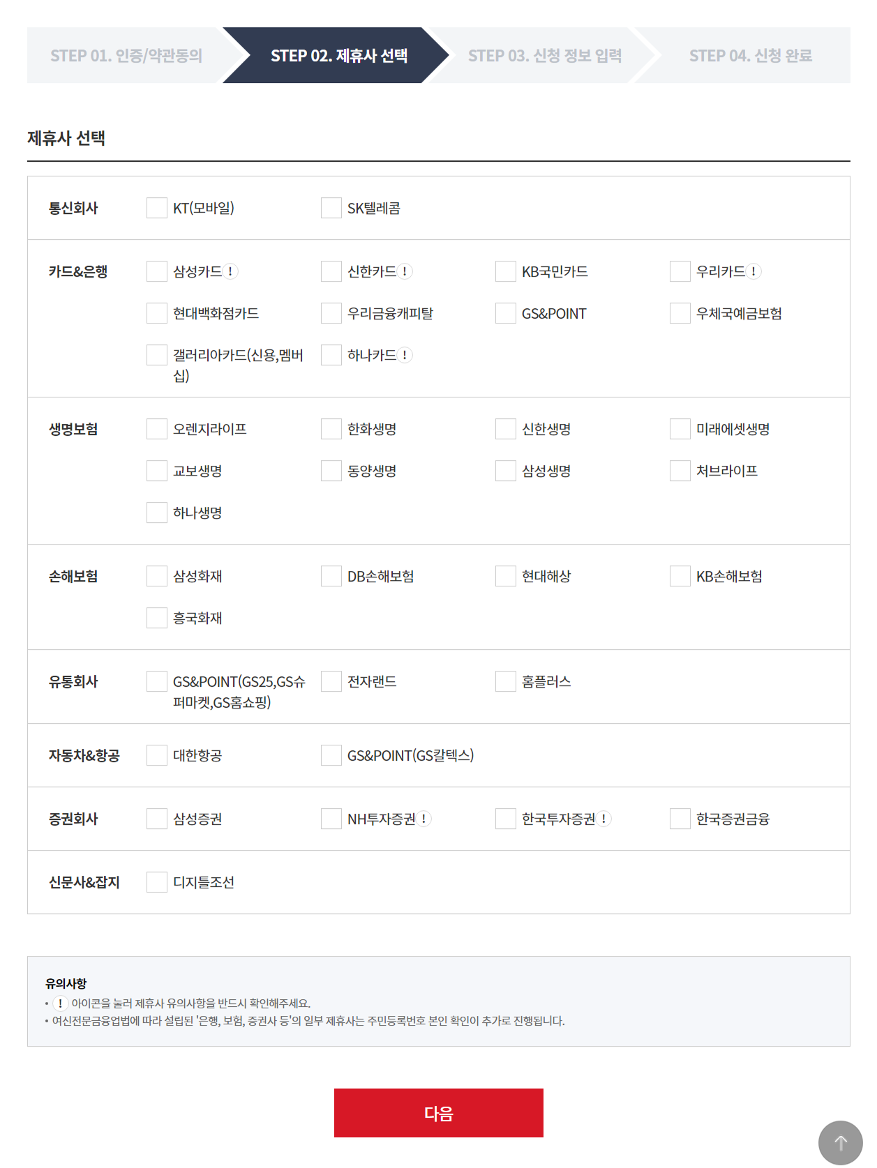 본인인증이 완료되면 주소 변경 대상 제휴사 목록이 나타납니다. 통신회사, 카드회사, 백화점 카드, 생명보험회사, 손해보험회사, 유통회사, 자동차 및 항공회사, 증권회사, 신문사 및 잡지 회사 중 필요한 곳만 선택합니다.