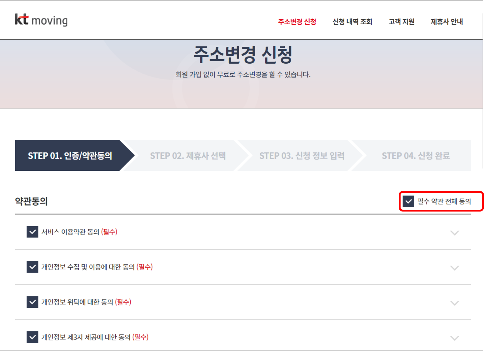 회원 가입 없이 무료로 주소변경을 할 수 있기 때문에 본인인증에 관한 약관 동의를 거칩니다. 맨 오른쪽 상단에 [필수 약관 전체 동의]를 선택하면 됩니다.