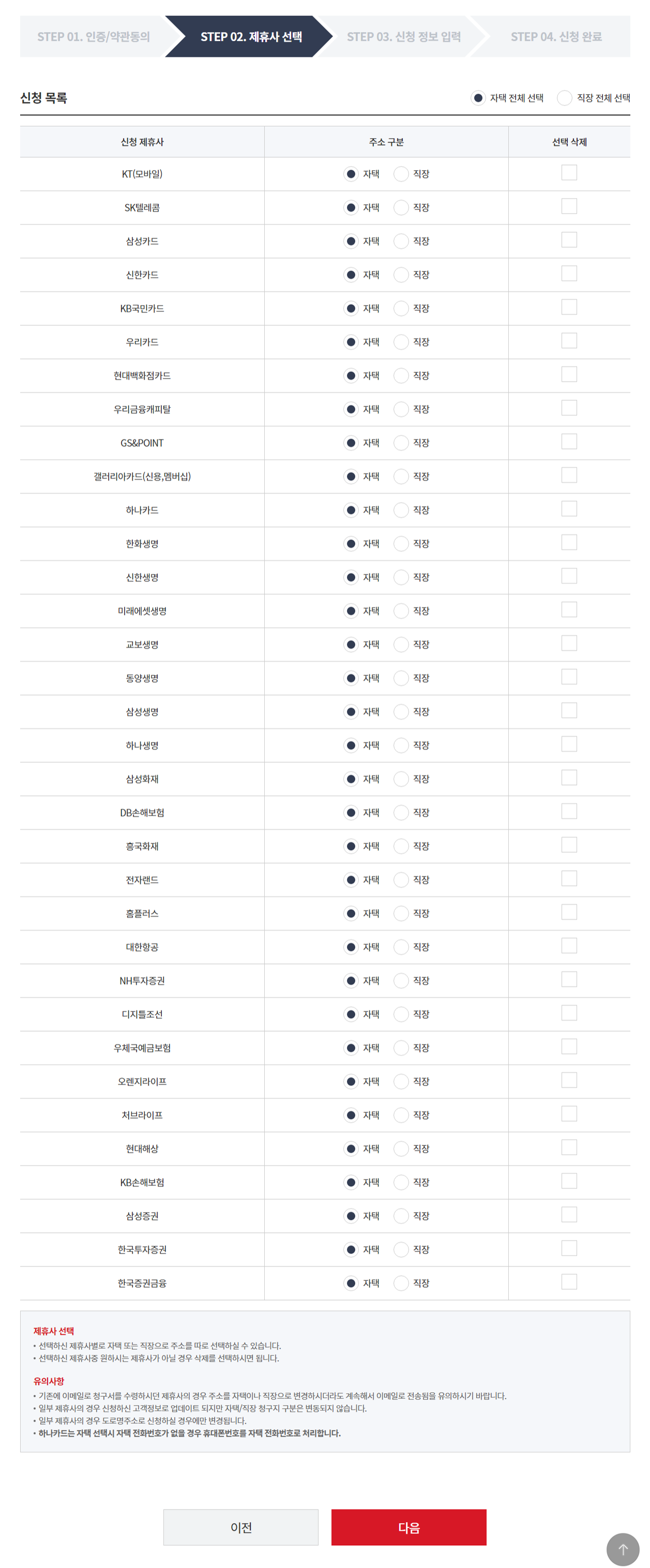 신청 완료한 제휴사 목록을 확인하고 바꿀 주소를 자택과 직장으로 각각 설정할 수 있습니다. 또한 신청 제휴사를 선택적으로 삭제할 수도 있습니다.