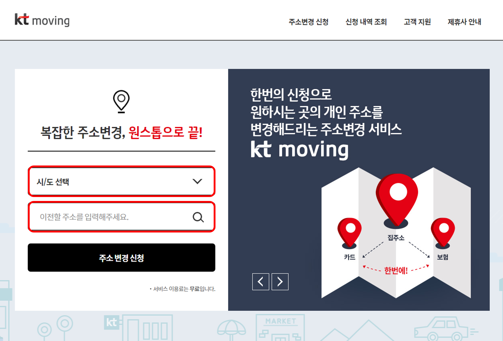 바로 케이티(KT)에서 제공하는 주소변경 원클릭 서비스, ktmoving입니다. 여러 기관에서 일일이 해야 하는 번거로움을 한 번의 클릭으로 해결할 수 있는 서비스입니다. 웬만한 주소변경은 다 지원하는 무료 서비스입니다.