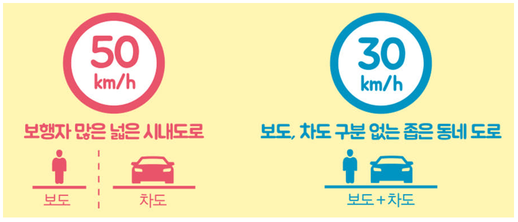도시지역 중 주거지역, 상업지역, 공업지역 내의 모든 일반도로는 최고 속도를 시속 50킬로미터로 제한하고, 차도와 보도가 명확하게 구분되지 않는 주택가와 도로, 그리고 어린이보호구역 등 보행자의 통행이 많은 이면도로는 시속 30킬로미터로 제한하는 교통정책입니다.