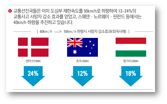 실제로 덴마크, 호주, 헝가리 등과 같은 교통선진국들에서 제한속도 시속 50킬로미터 하향으로 인한 교통사고 사망자 감소효과를 경험하였습니다. 이에 더해 스웨덴, 노르웨이, 핀란드에서는 시속 40킬로미터로 하향하는 방안을 추진하고 있습니다.