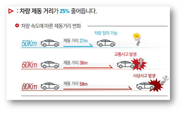 그런데 속도를 시속 10킬로미터 줄이면 차량이 브레이크를 밟고 멈추는 데까지 거리가 25% 줄어듭니다.