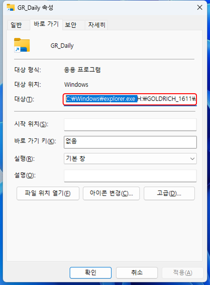 바로가기에서 마우스 오른쪽 버튼을 클릭해서 "속성"을 선택하면 아래와 같은 속성 창이 나타납니다. 속성 창에는 이미 대상(T)에 파일의 경로가 지정되어 있습니다. 따라서 파일의 경로 앞에 단순히 explorer 만 입력하면 됩니다.