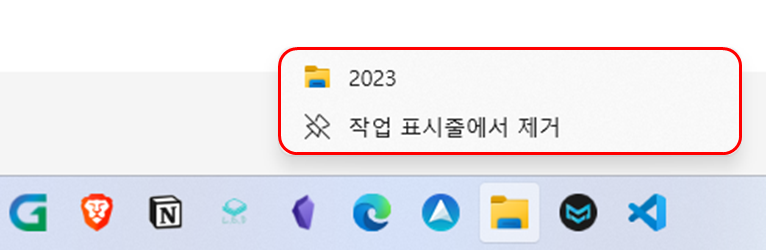 그래서 방법을 찾다가 꼼수를 발견하였습니다. 그래서 지금은 기존의 도구모음처럼은 아니지만 별도의 런쳐 프로그램 없이 잘 사용하고 있습니다. 자 지금부터 꼼수를 따라해 볼까요? 고정하면 아래 화면처럼 "2023" 폴더가 작업 표시줄에 고정이 됩니다. 다만, 예전처럼 클릭하면 모든 파일 목록이 뜨는 것이 아니라 폴더 전체를 여는 것만 가능합니다. 좀 아쉬운 부분입니다.