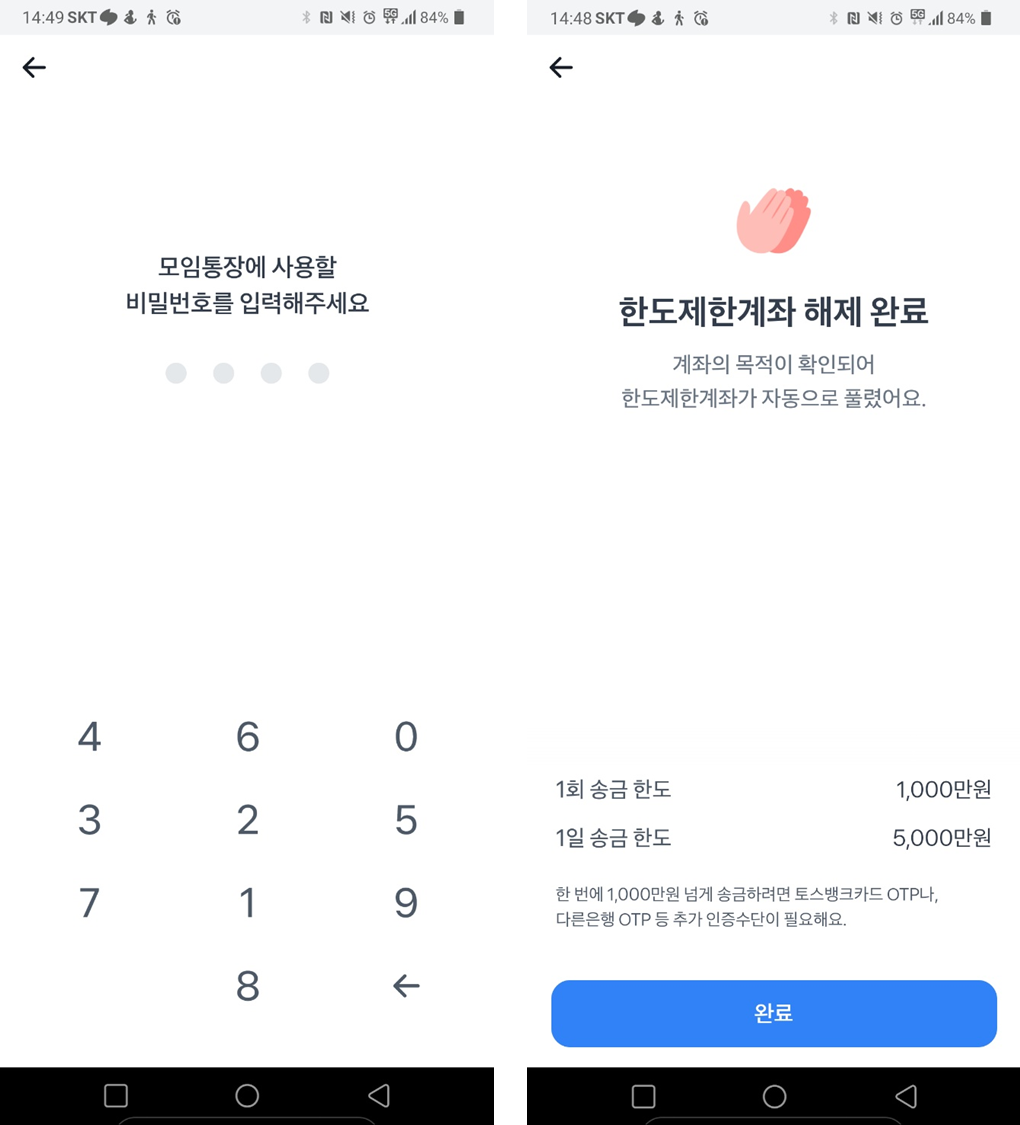모임 통장에 사용할 비밀번호를 설정하고 다음을 누르면 한도 계좌 해제와 함께 토스뱅크 모임통장 개설 절차가 끝납니다.