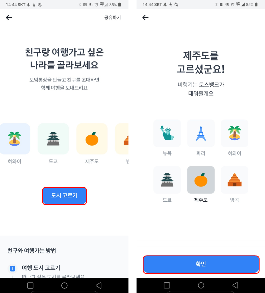 토스는 현재 모임통장 만들기 이벤트를 하고 있습니다. 모임통장을 만들고 멤버를 초대하면 선택한 여행지를 보내주는 이벤트입니다. 일단 제주도를 골라봅니다. 제주도 외에도 뉴욕, 파리, 하와이, 도쿄, 방콕 등이 있습니다. 원하는 대로 마음껏 고르시면 됩니다. 원하는 도시를 고르고 "다음"을 클릭합니다.