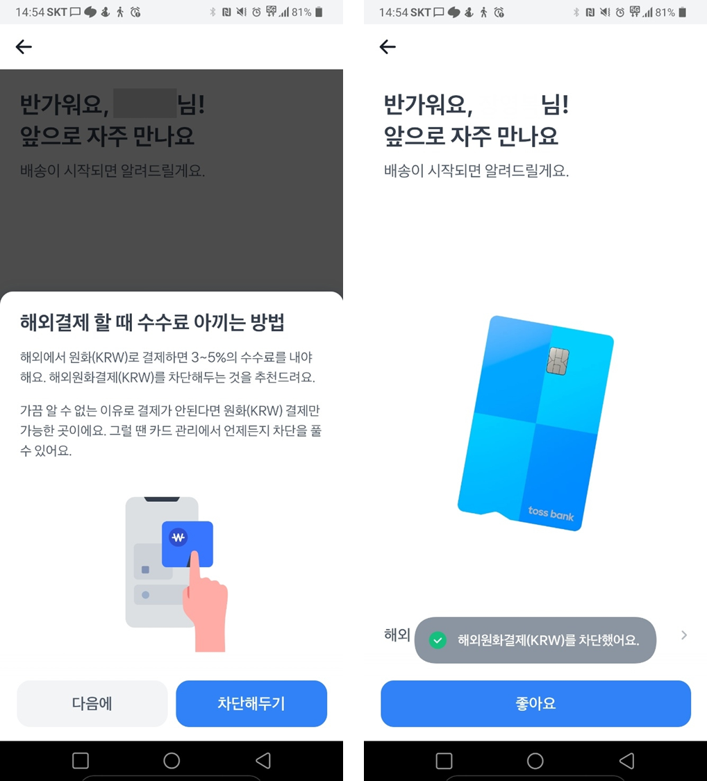 마지막으로 해외결제 차단에 대한 안내입니다. 저는 국내전용 모임통장으로 사용할 예정이므로 해외결제 차단을 신청해 두었습니다.