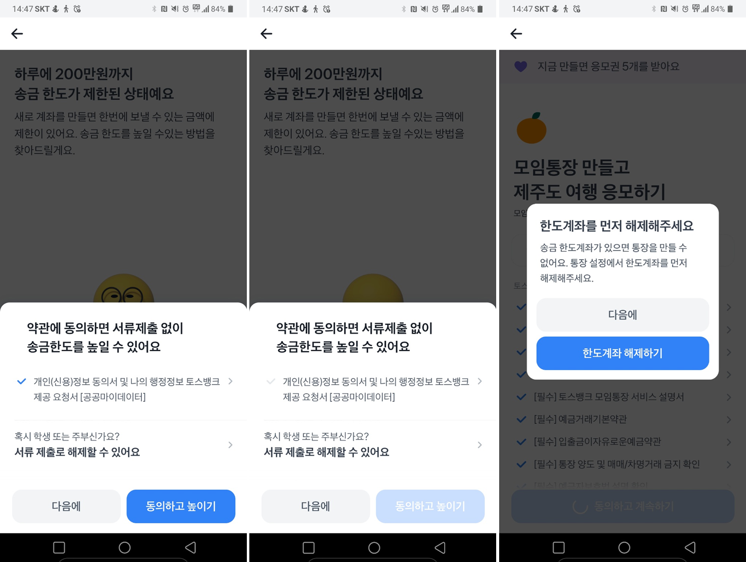 한도 계좌가 해제되었습니다. 이제는 토스뱅크 모임통장 관련 필수 서류를 열람하고, 개별 항목별로 동의해야 합니다. 전 항목에 동의하면 다음으로 넘어갑니다. 또 한 번 본인 인증 절차를 거칩니다.