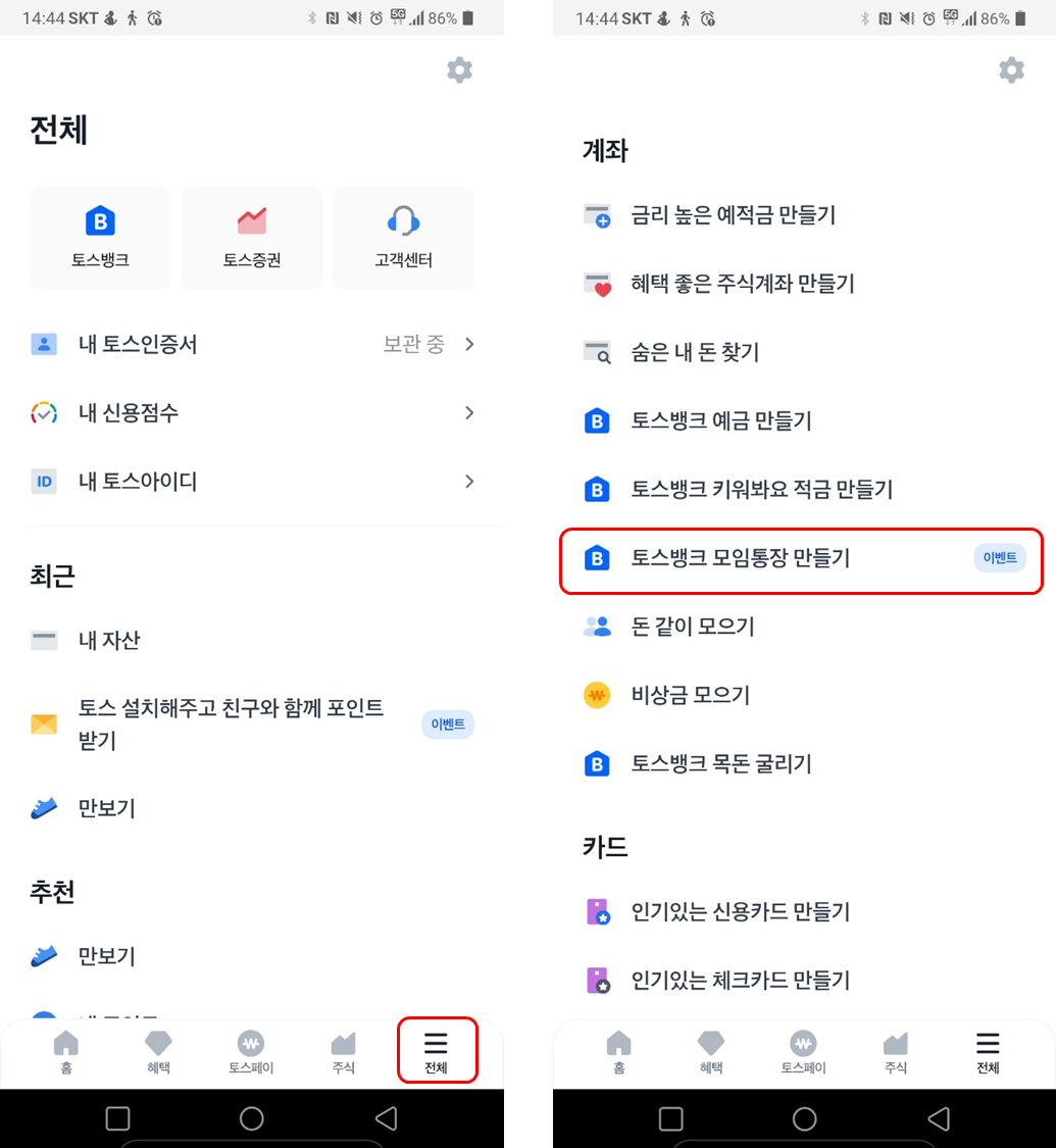 토스 앱을 켜서 들어가면 아래에 "전체"를 클릭합니다. 그리고 아래로 내려보면 계좌 > 토스뱅크 모임통장 만들기가 있습니다. 클릭합니다.