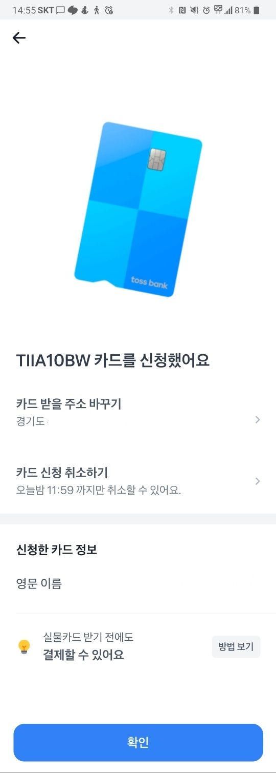 드디어 토스뱅크 모임통장 전용 체크카드 신청을 완료하였습니다. 수령할 때까지 보통 2주 정도 걸린다는 문자를 받았습니다. 혹시 체크카드가 필요하지 않다면 아래 안내처럼 11:59분까지 취소 가능합니다.