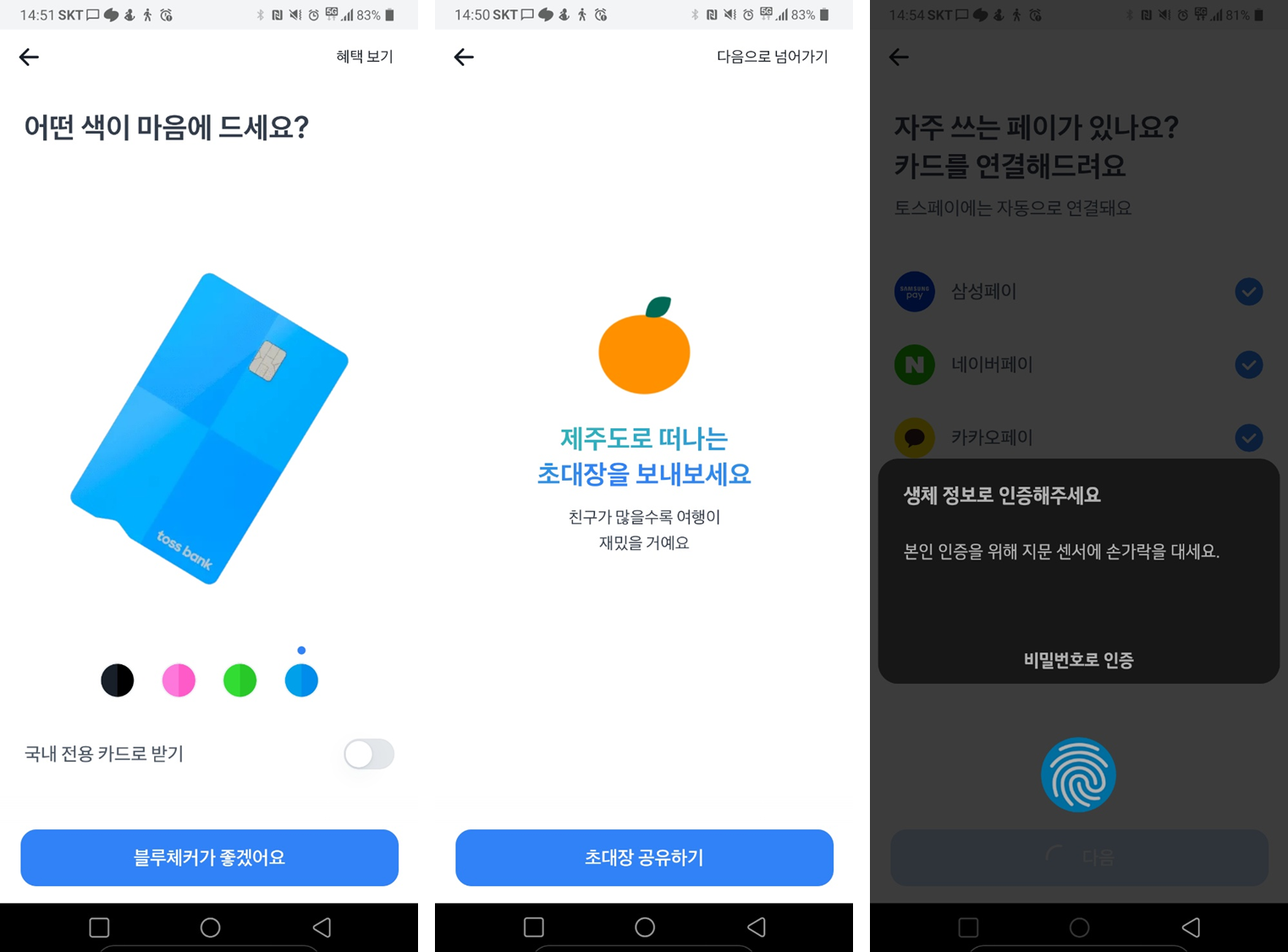 다음으로 체크카드의 색상을 선택합니다. 검은색 계열, 핑크색 계열, 녹색 계열, 파란색 계열 중 하나를 선택할 수 있습니다. 저는 블루체커라는 파란색 계열의 색상을 선택했습니다. 그리고 토스가 가장 잘하는 초대장 보내는 화면이 나옵니다. 모임통장의 요건에 따라 미리 모임의 의견 수렴이 있다면 가장 좋습니다. 아직 결정 전이라면 맨 위에 있는 "다음으로 넘어가기"를 눌러 넘어가면 됩니다. 그리고 지문 인증의 절차를 거칩니다.