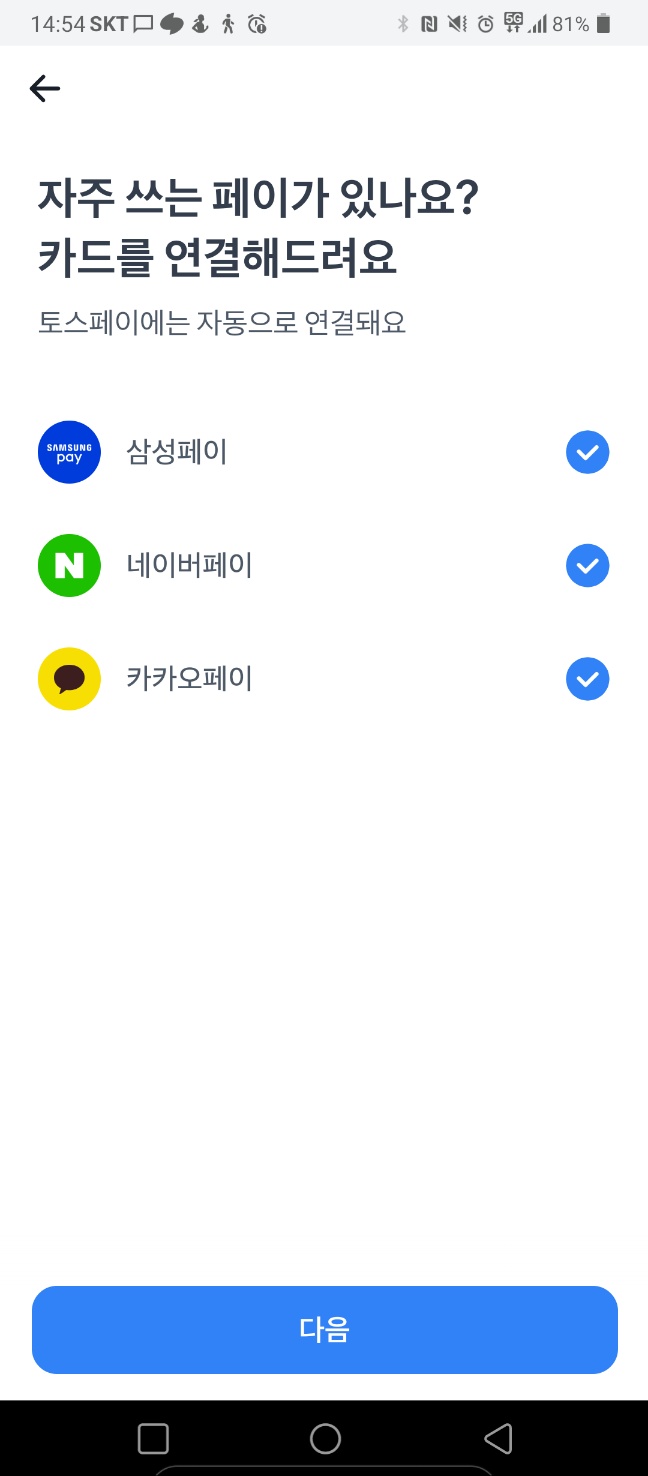 토스뱅크 모임통장 전용 체크카드의 편의성을 위해 삼성페이, 네이버페이, 카카오페이를 연동할 수 있습니다. 저는 3가지 모두 사용중이기 때문에 모두 연결하였습니다. 본인의 선택에 따라 선택하지 않아도 상관 없습니다.