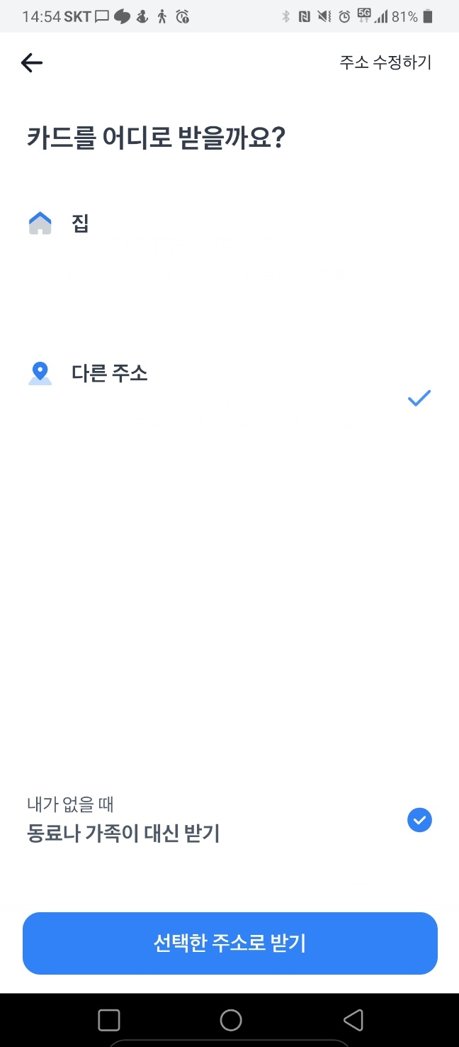 다음은 체크카드를 수령할 곳을 지정합니다. 저는 집 대신 회사를 선택해서 수령할 예정입니다.
