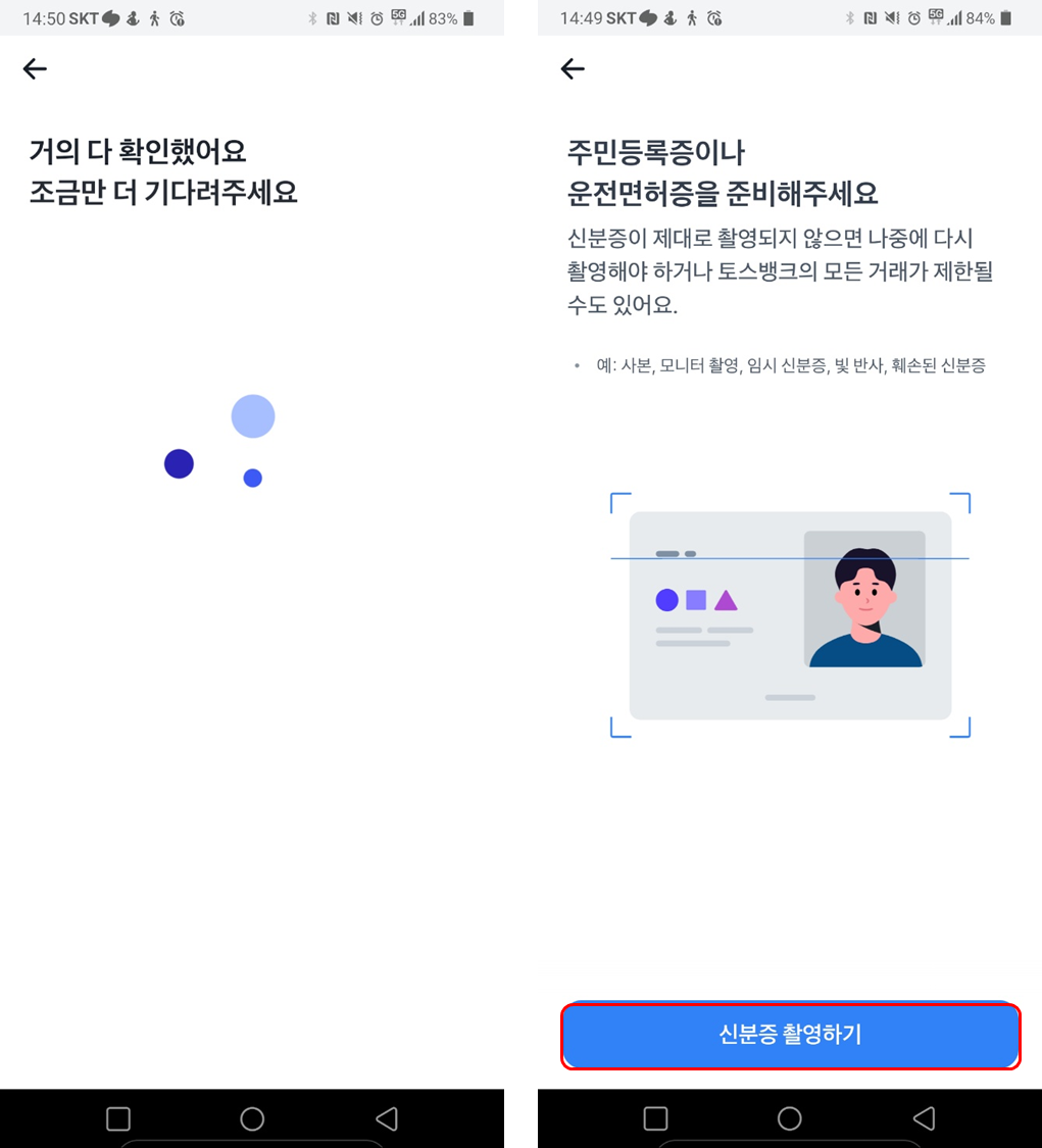 주민등록증이나 운전면허증을 통한 본인 확인 절차를 거칩니다. 비대면 인증이라 미리 신분증을 준비하고 다음을 진행합니다. "신분증 촬영하기"를 클릭해서 주민등록증이나 운전면허증을 촬영합니다.