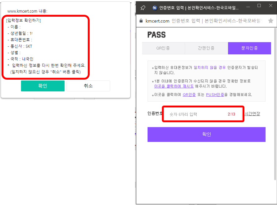 입력한 본인정보에 대한 확인 메시지가 나타납니다. 내용을 확인하고, 정보가 맞다면 다음 단계로 이동합니다. 휴대폰으로 전송된 6자리의 인증번호를 입력합니다.