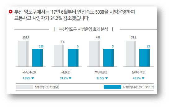 우리나라에서도 2021년 4월 시행에 앞서 2017년 6월부터 부산 영도구를 특정하여 안전속도 5030을 시범운영하였습니다. 그 결과 교통사고 사망자가 24.2% 감소하는 효과를 거두었습니다.